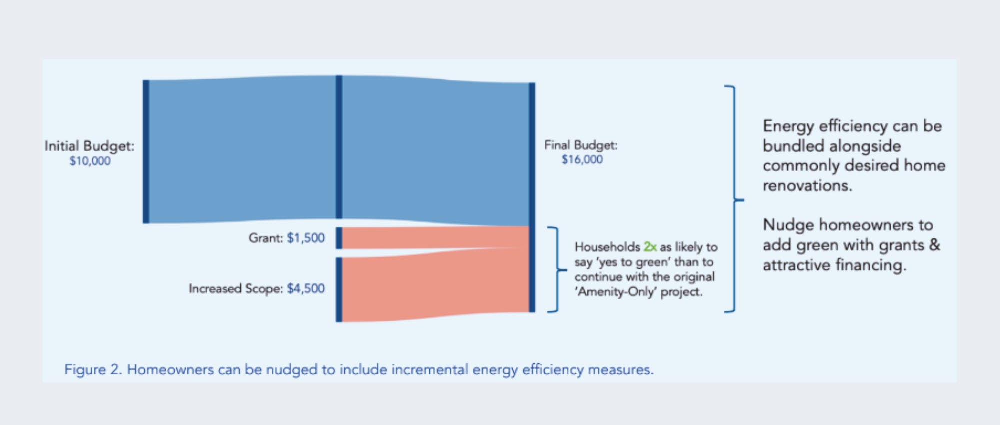 This information provides a new, people-centered lens to financing program design. Instead of trying to convince homeowners to take out loans, why not target people already undertaking home renovations by offering an easy way to add cost-saving efficiency measures to their project? The first barrier of shifting someone into a home improvement mind-set is removed and they are more receptive to learning about the benefits of adding energy efficiency measures.