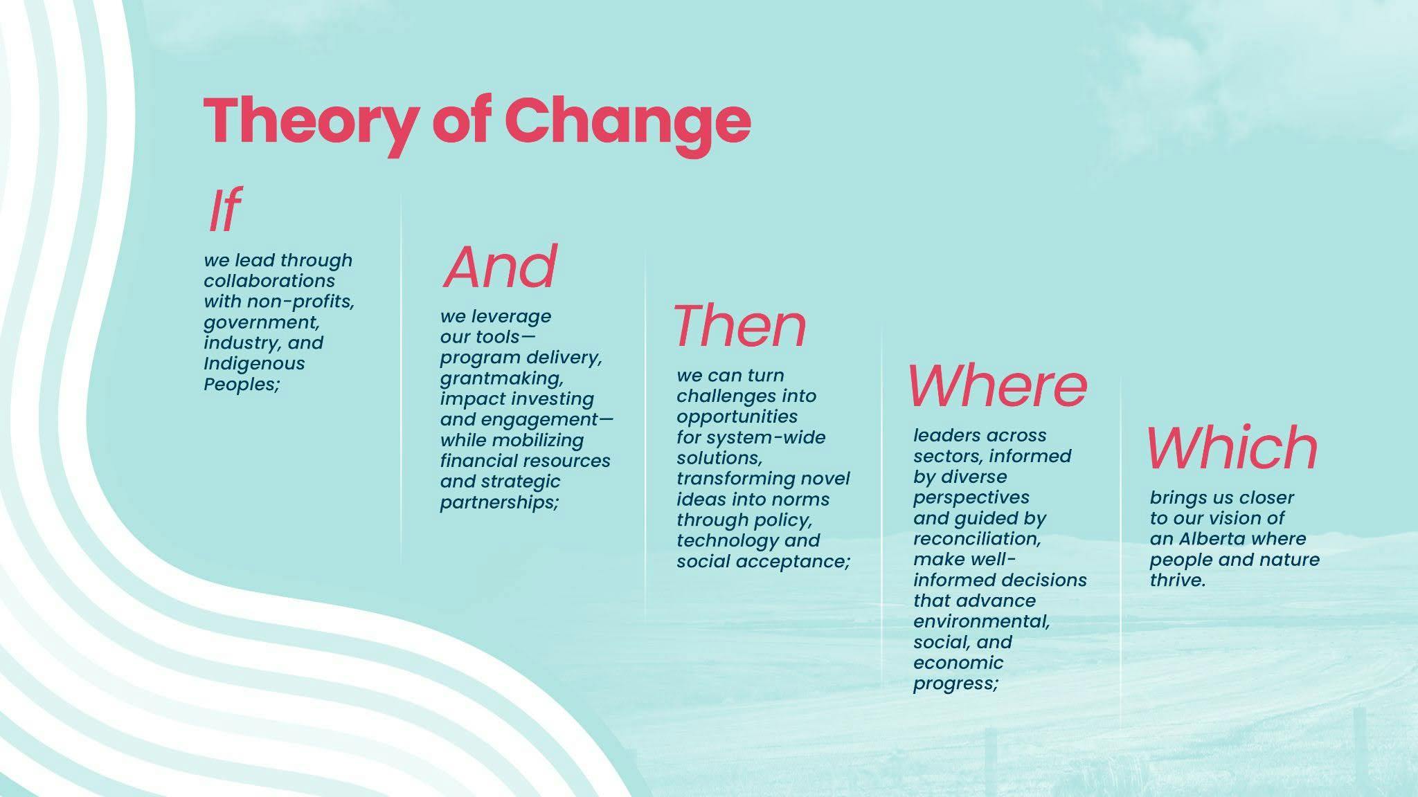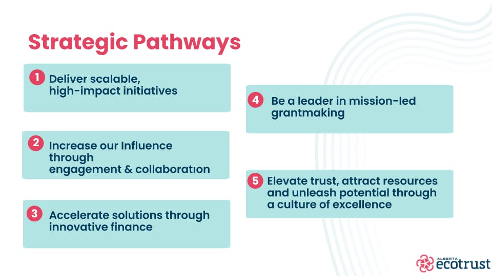 Leaning into our legacy as a grant-maker, our third strategic pathway focuses on enabling our ecosystem partners to do connected, impactful, scalable work that is aligned with our charitable objectives. Supporting a robust non-profit and charitable sector is a key strategy that Alberta Ecotrust has supported for over thirty years. And finally, we can do none of these things if we don't have a modernized organizational infrastructure and culture of excellence where our employees are valued and supported, our systems are strong, and our management is rigorous. The real impact will not be created by any singular strategic pathway, but rather by marrying all these approaches and strategic directions to keep us moving towards our objectives.