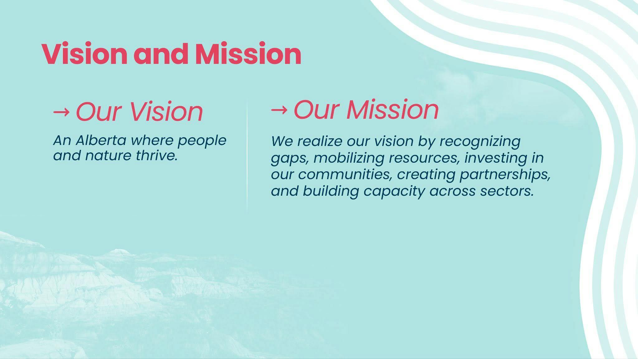 Alberta Ecotrust's mission was also updated to reflect our new integrated approach to creating systems change while ensuring we continue to support the non-profit and charitable sectors as well as all actors in the ecosystem. The mission is to "realize our vision by recognizing gaps, mobilizing resources, investing in our communities, creating partnerships, and building capacity across sectors.” It is meant to be a statement that provides a clear and actionable roadmap to our intended outcomes with a clear intent to collaborate, partner and work together to solve complex societal challenges.